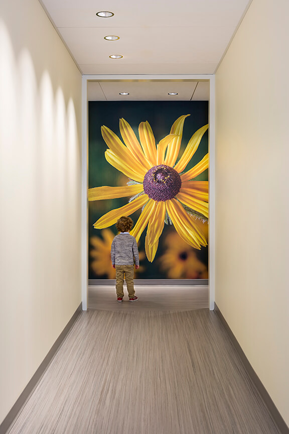 In 2014, Children’s Hospitals & Clinics of Minnesota developed the first-of-its-kind Pediatric Pain, Palliative and Integrative Medicine Clinic. From the moment of arrival, signaled by the entryway gong, to images of Minnesota flowers, plants & landscapes, the sound in the clinic is that of a natural environment: wind, water and bird calls. With the vision and leadership of Dr. Stefan Friedrichsdorf MD, this 10,000-square-foot clinic exclusively helps young patients using state of the art and age-old treatments. From massage and biofeedback rooms, to the Multi-Sensory Environment  (Snoezelen® Room), the focus is entirely on the creating a non-clinical environment for the patient and family.