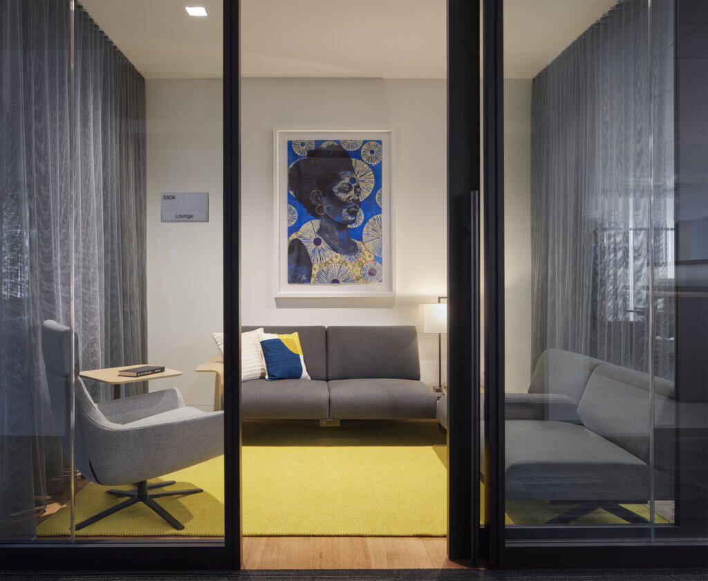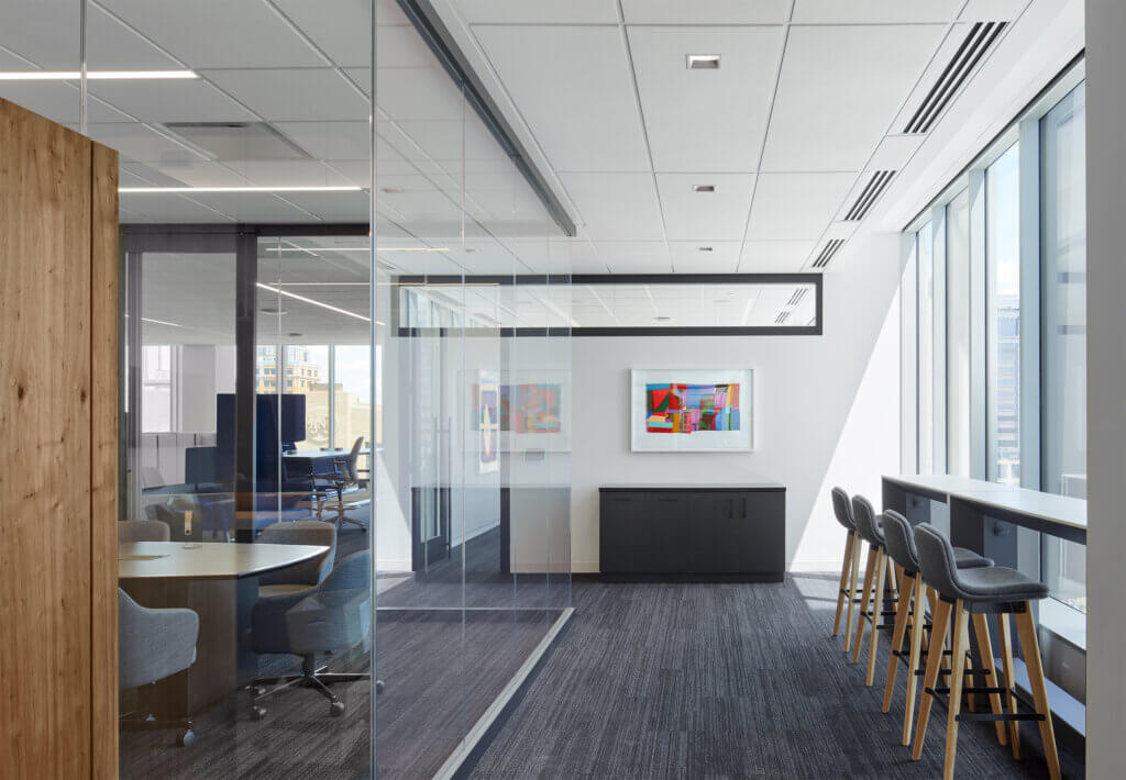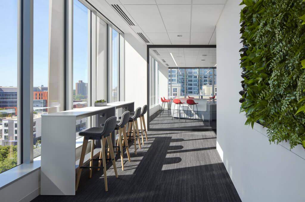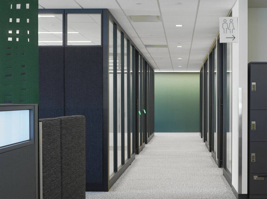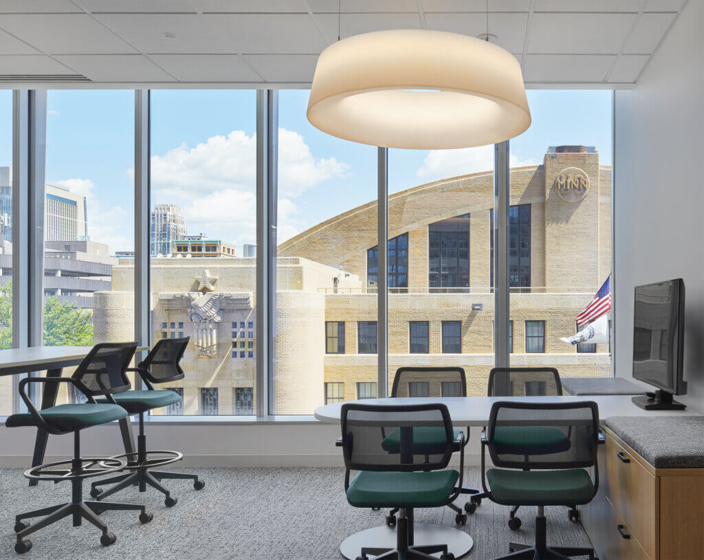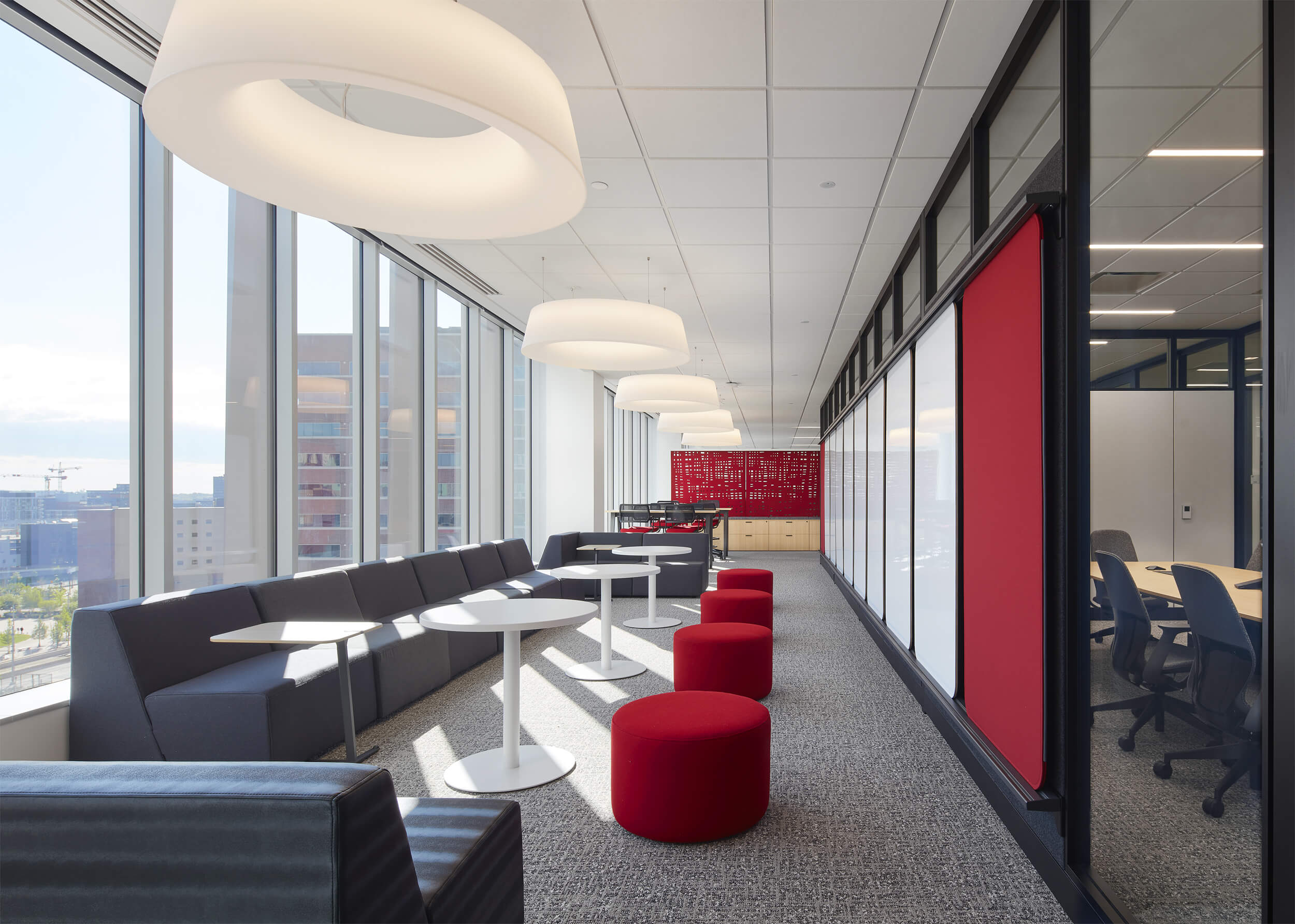 Over 900 Steelcase Answer workstations were installed and more than 80 Steelcase Universal and Elective Element private offices with glass fronts supported staff with 12 executive offices. Meeting spaces were also high on the priority list, resulting in 30 conference rooms with Nevers custom conference tables and 30 huddle rooms.