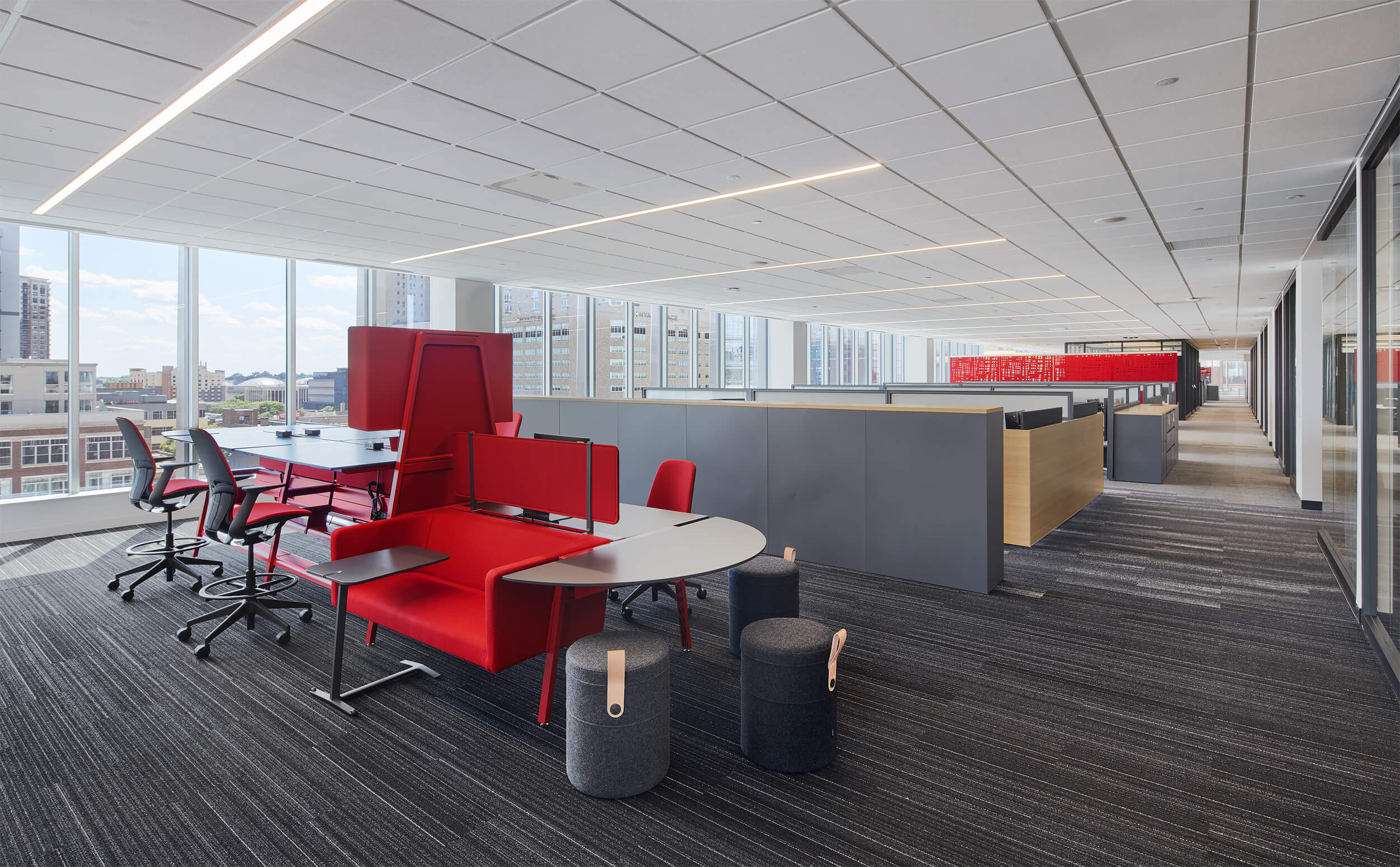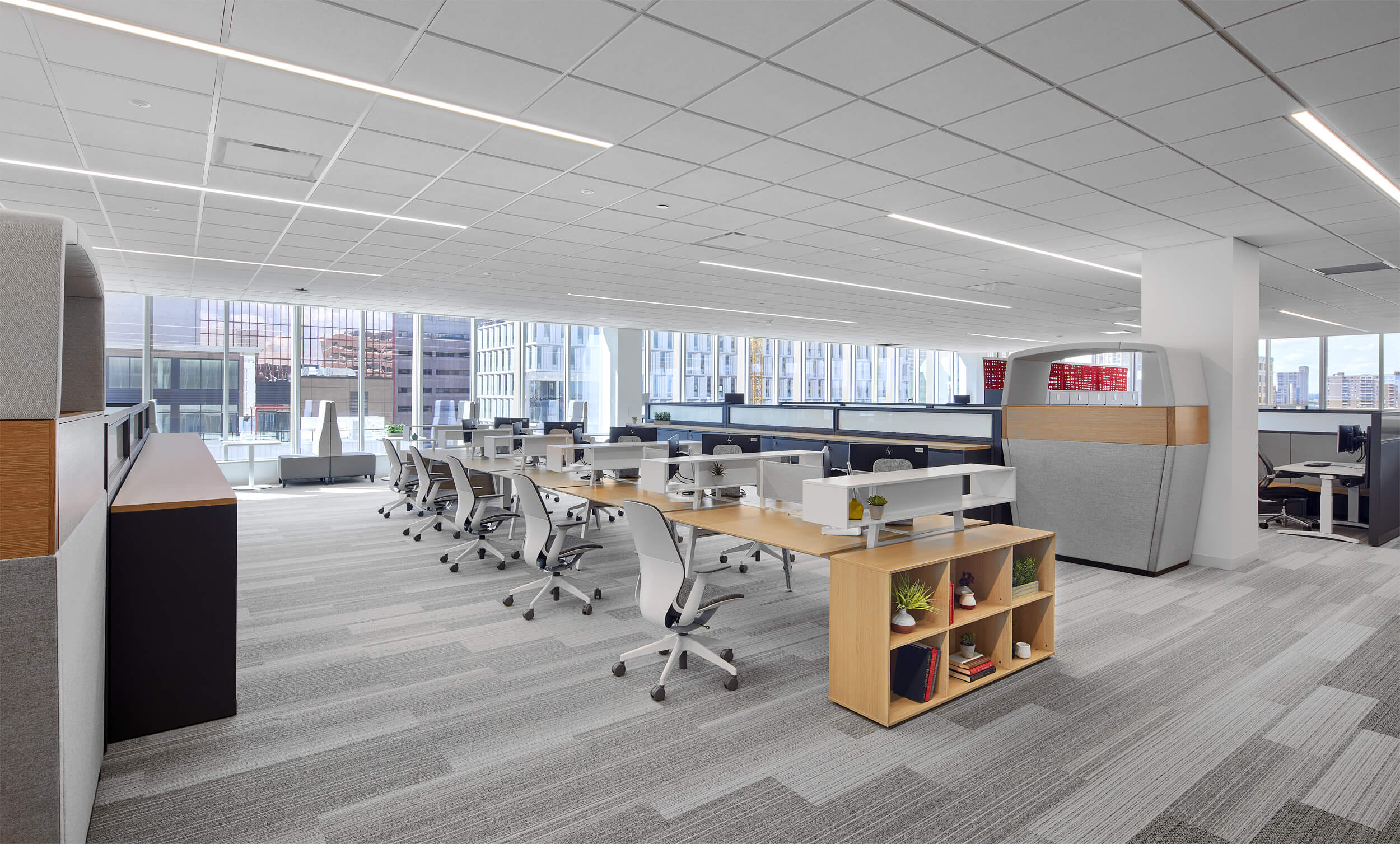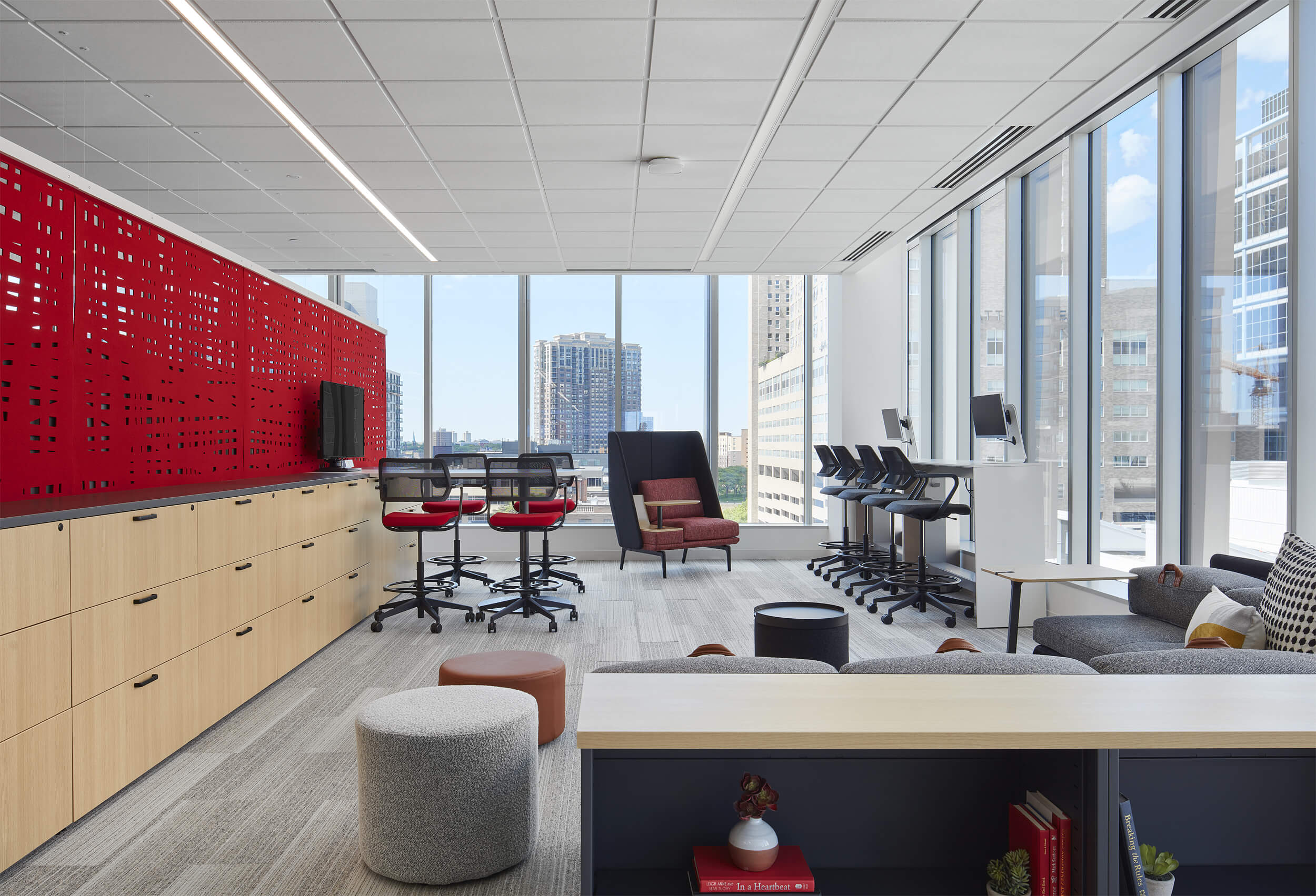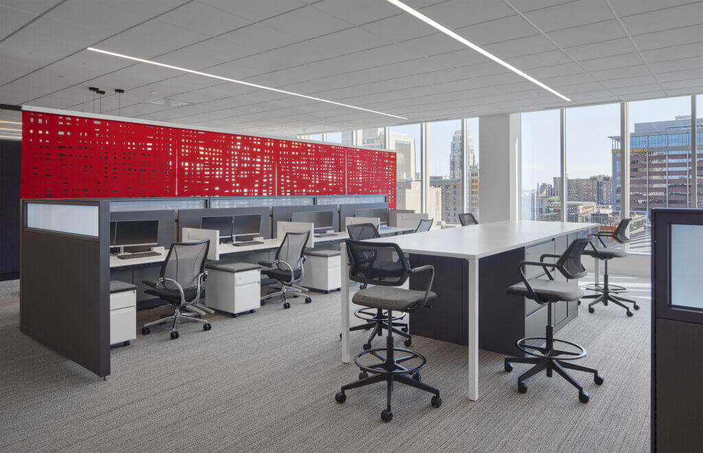 A Fortune-500 Financial Services Organization relocated from a larger 16-story building with older traditional furniture to a brand new, 8-story open collaborative and vibrant space. The new building highlights the architecture along with the nomadic approach of free-address for 70% of its workforce. One of the goals of the client was to lower the heights of the panels to allow more natural light from windows. Additionally, they wanted to create more social areas for gathering by incorporating 8 front porch and break areas, Co-Lab spaces, and collaborative work areas.