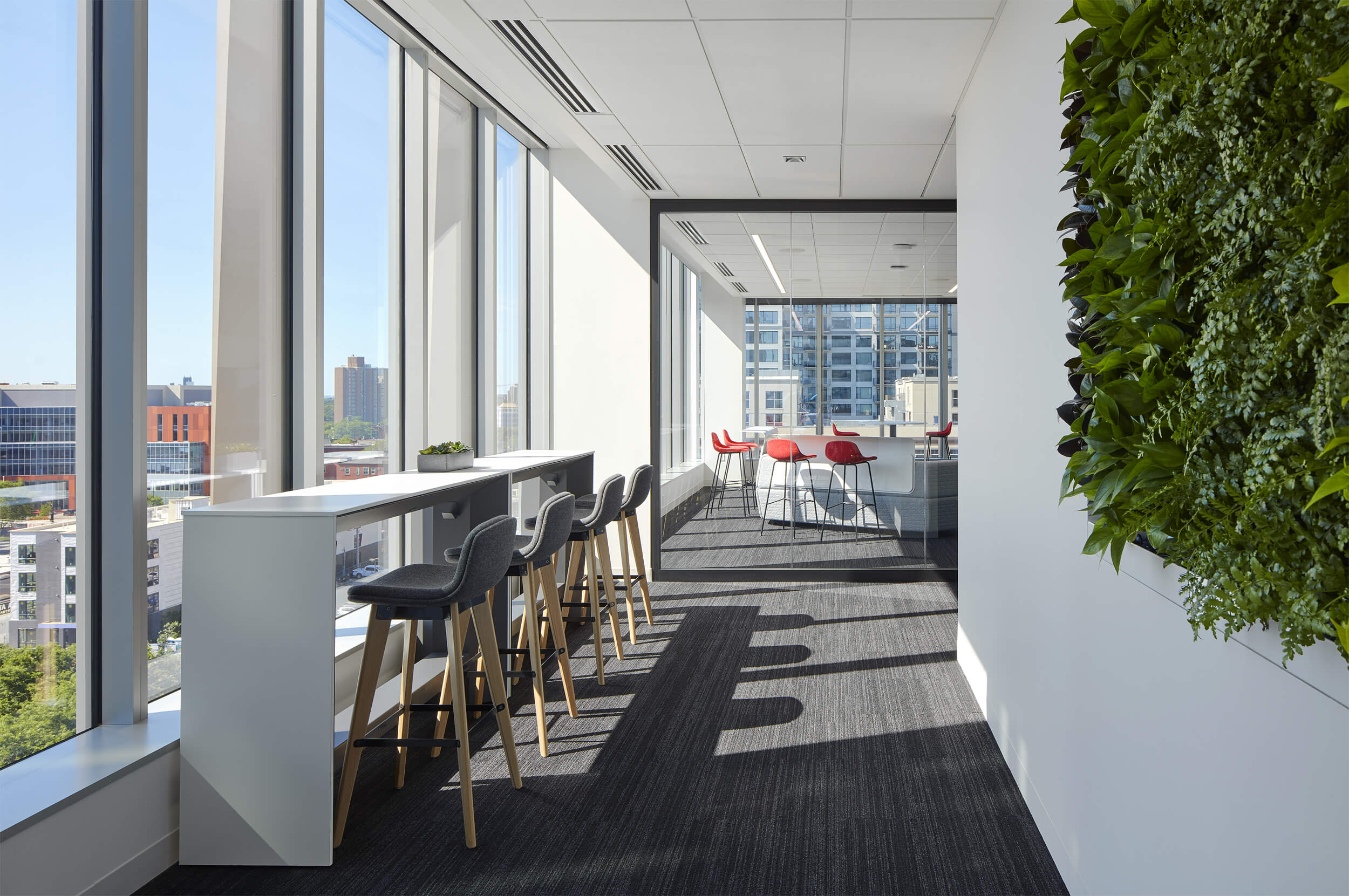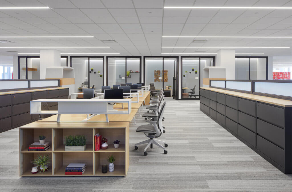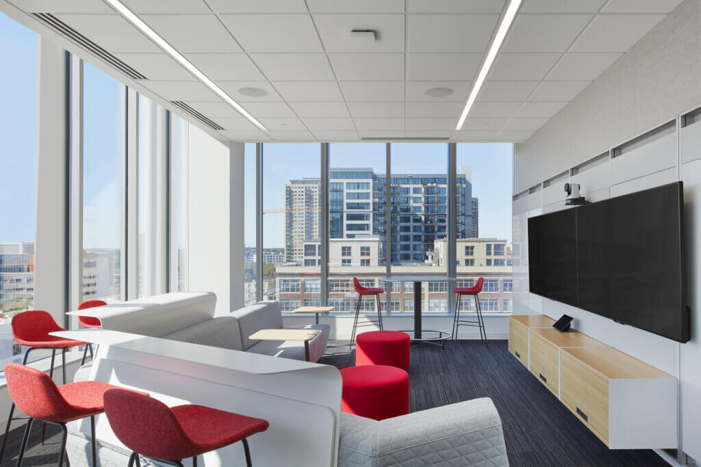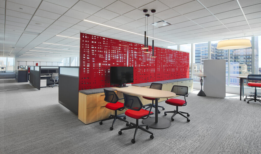 A Fortune-500 Financial Services Organization relocated from a larger 16-story building with older traditional furniture to a brand new, 8-story open collaborative and vibrant space. The new building highlights the architecture along with the nomadic approach of free-address for 70% of its workforce. One of the goals of the client was to lower the heights of the panels to allow more natural light from windows. Additionally, they wanted to create more social areas for gathering by incorporating 8 front porch and break areas, Co-Lab spaces, and collaborative work areas.