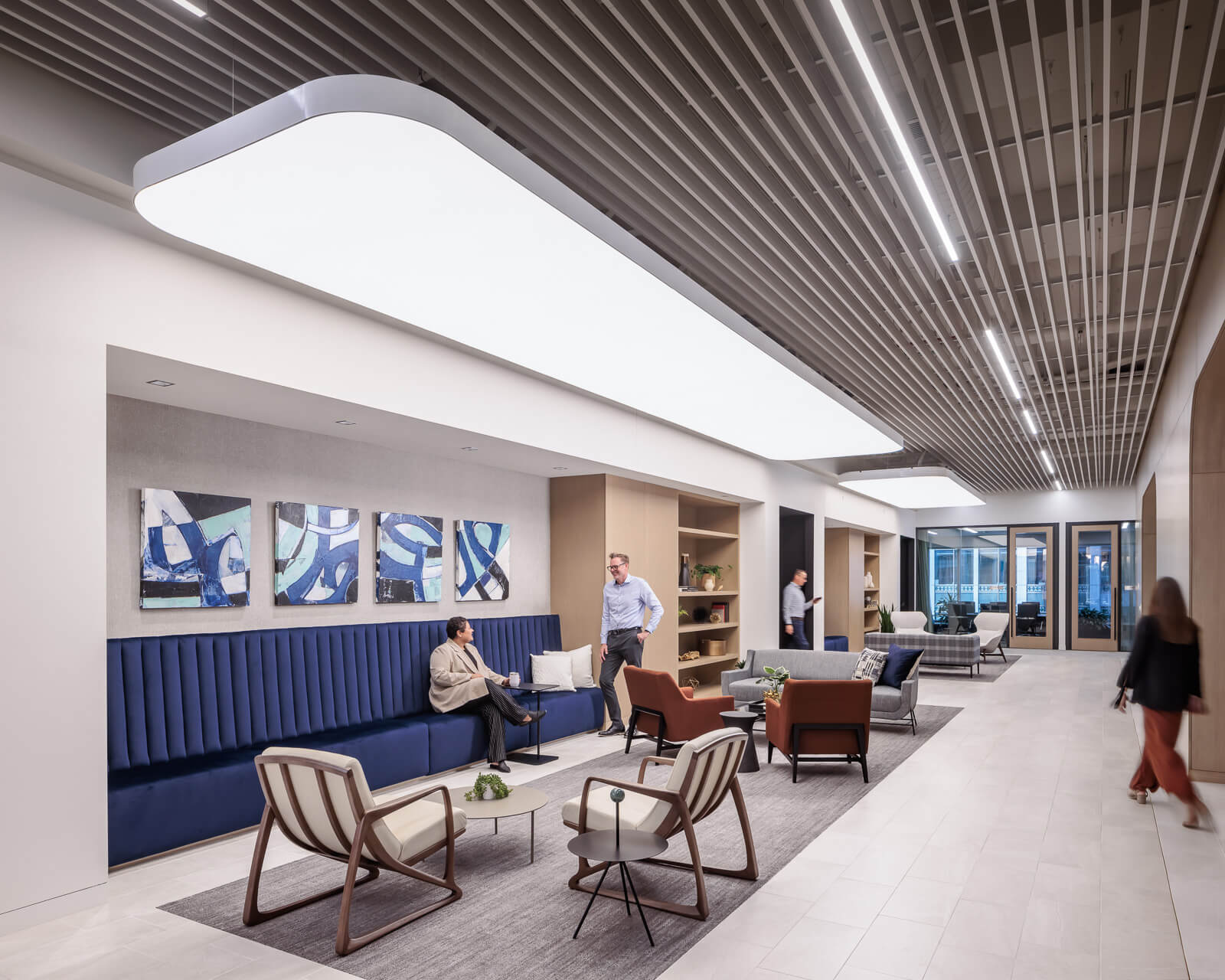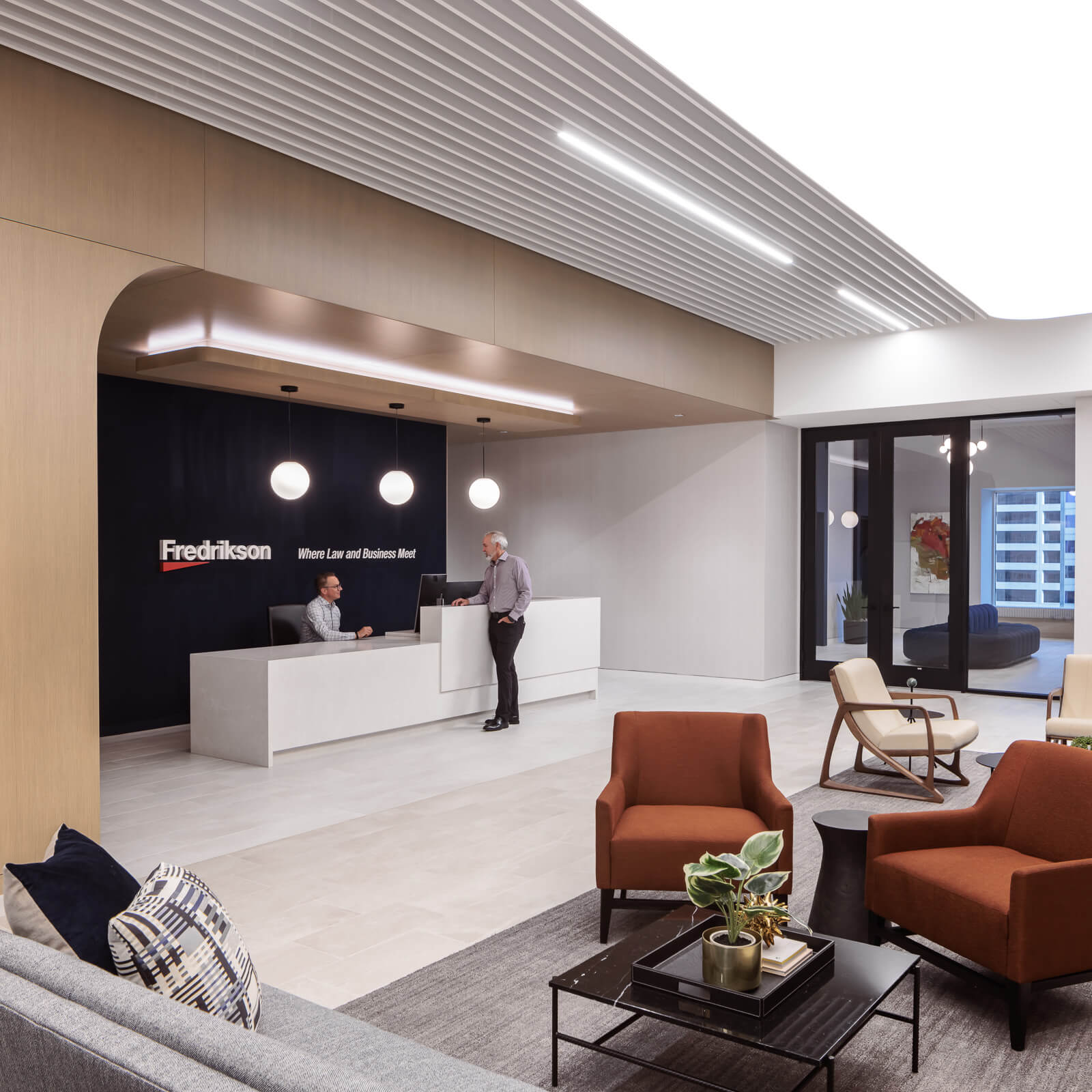 In their continued commitment to downtown Minneapolis, Fredrikson & Byron, P.A. recently moved its office into the 60 South Sixth building. As one of the largest and fastest growing law firms in the region, Fredrikson’s newly renovated space provides state-of-the-art technology and workspace amenities that allow the firm to continue to provide exceptional and efficient services to their clients. Throughout the eight floors, the firm’s 564 personnel utilize a combination of assigned and reserved offices, conference rooms, collaborative meeting spaces, and wellness rooms to support a dynamic, hybrid work style.