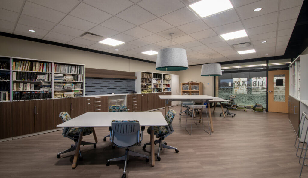 The 700+ square foot Interior Design Resource Library reflects real-world versions used at office dealerships and architecture firms. The Madison College Facility Designer specifically wanted to replicate the design libraries in Atmosphere’s Madison and De Pere Worklabs.