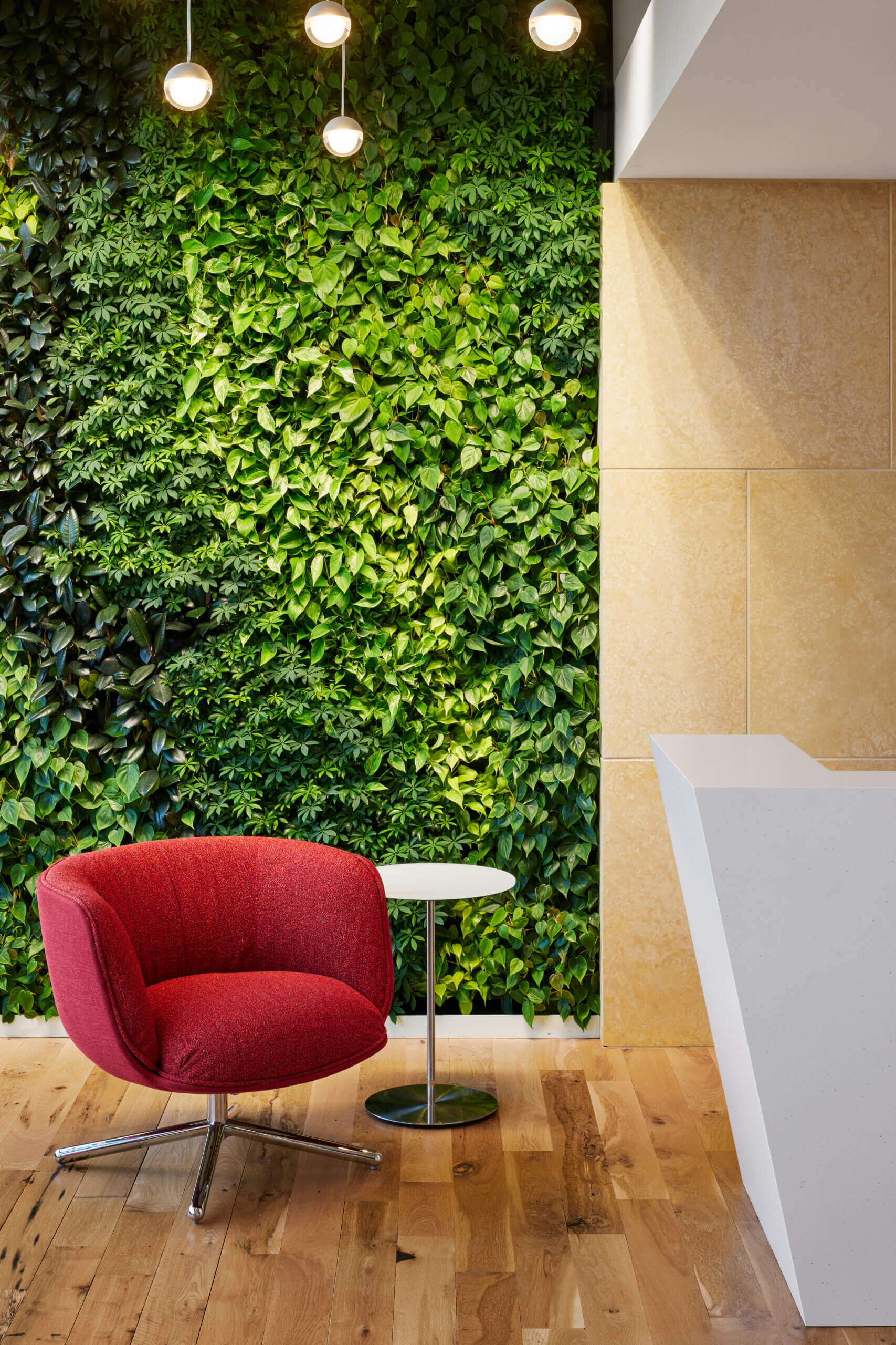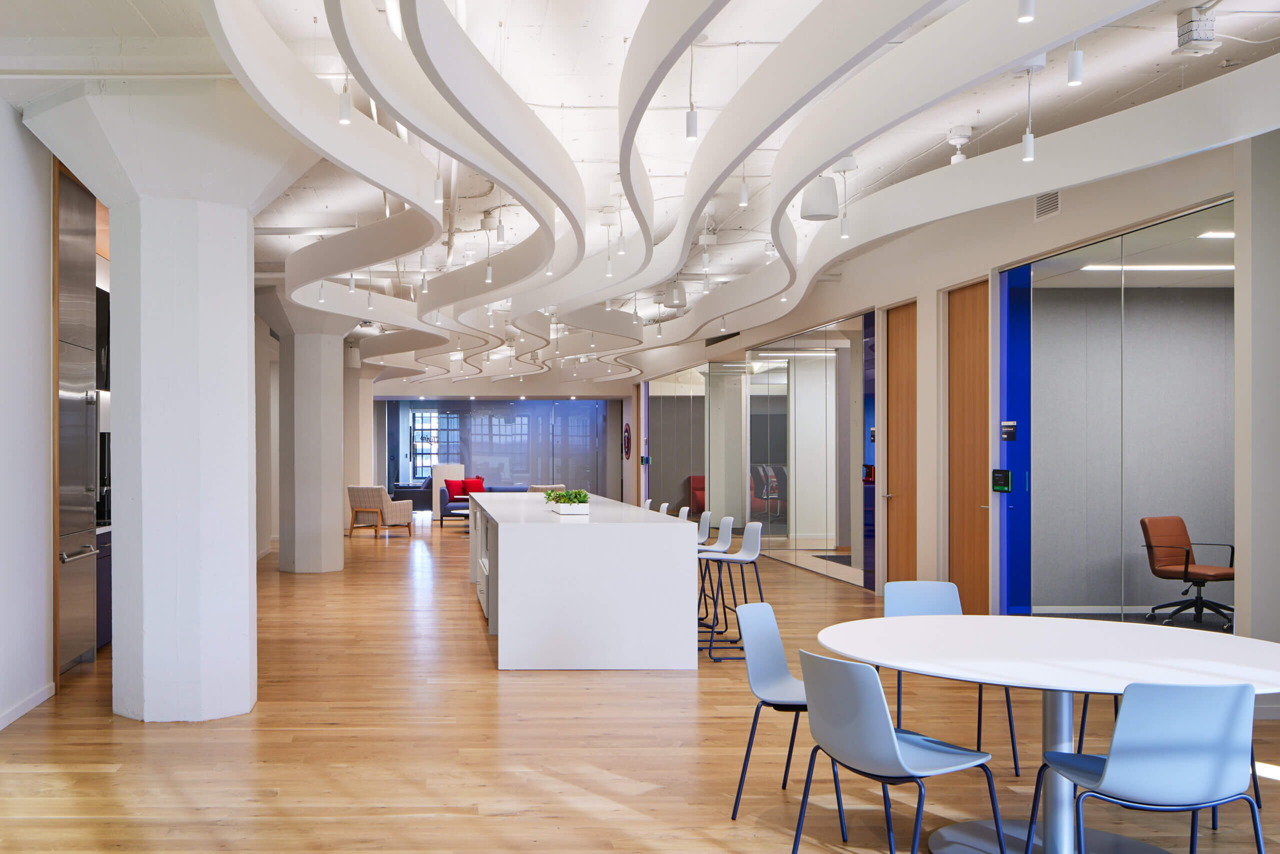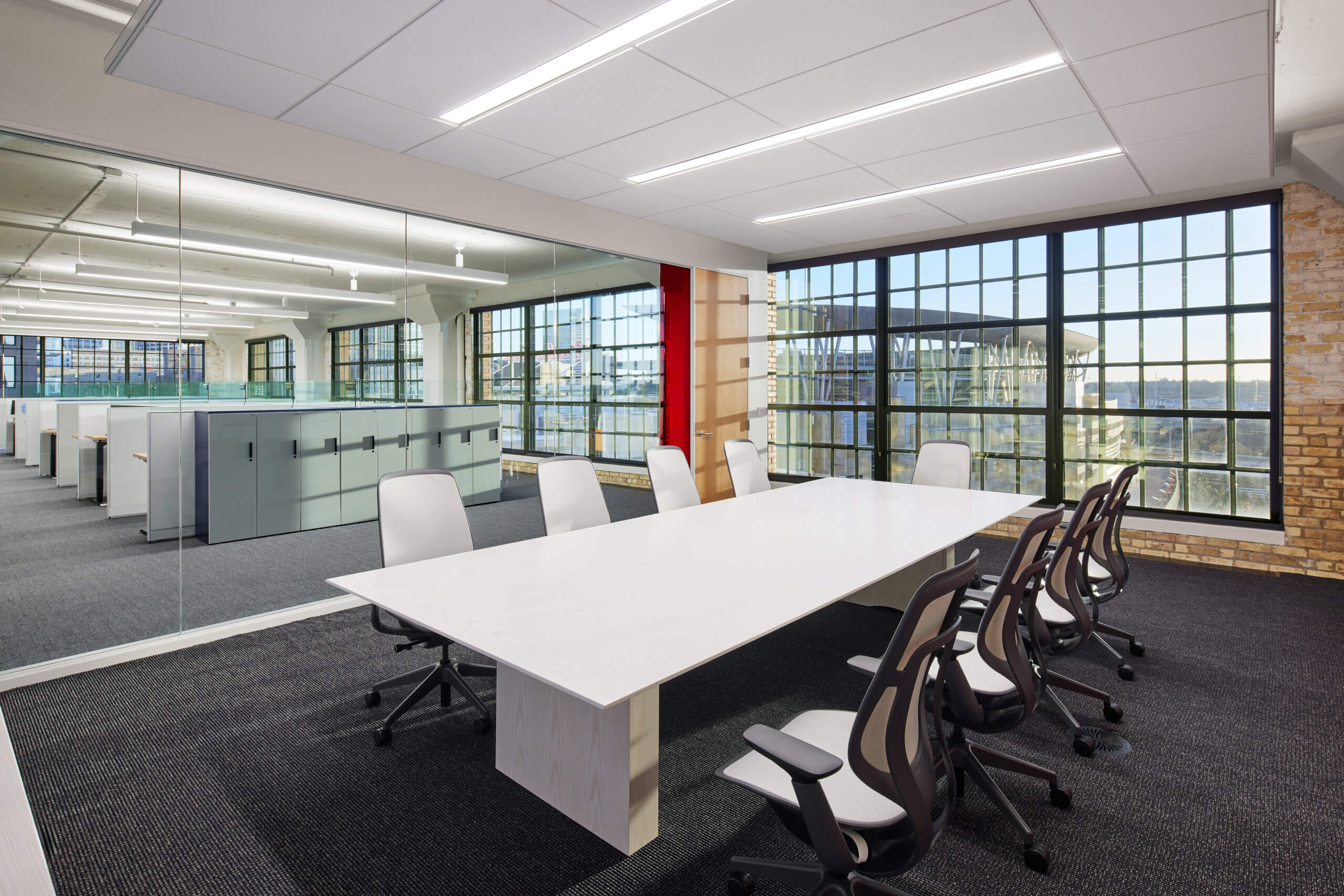 The floorplate also includes touch-down areas with varying degrees of privacy. The beautiful Coalesse seating provides a semi-public space for impromptu meetings and quick chats, while the individual rooms are ideal for focus work or private calls. Per specific request from the Twins franchise, Atmosphere integrated dedicated wellness rooms within the workspace, offering private space for relaxation and meditation.