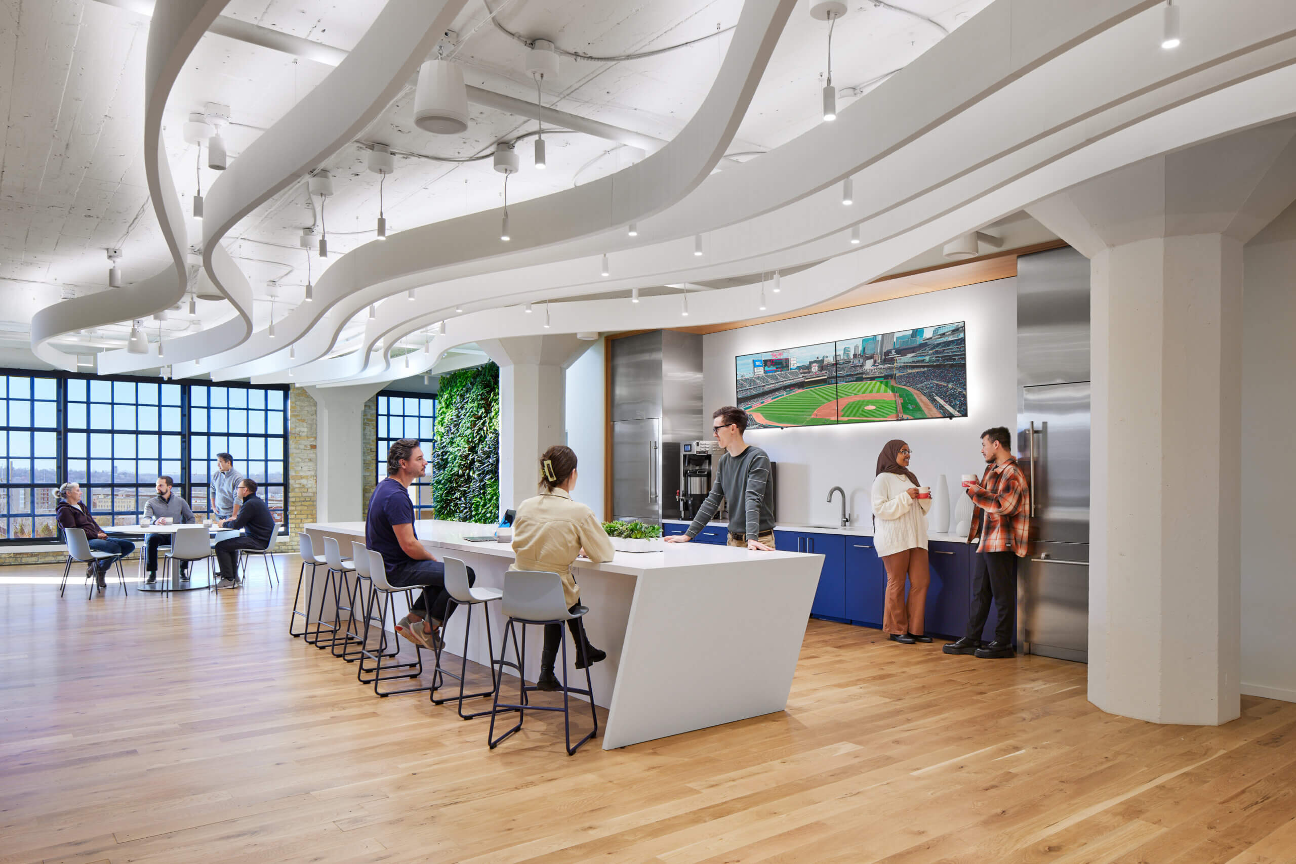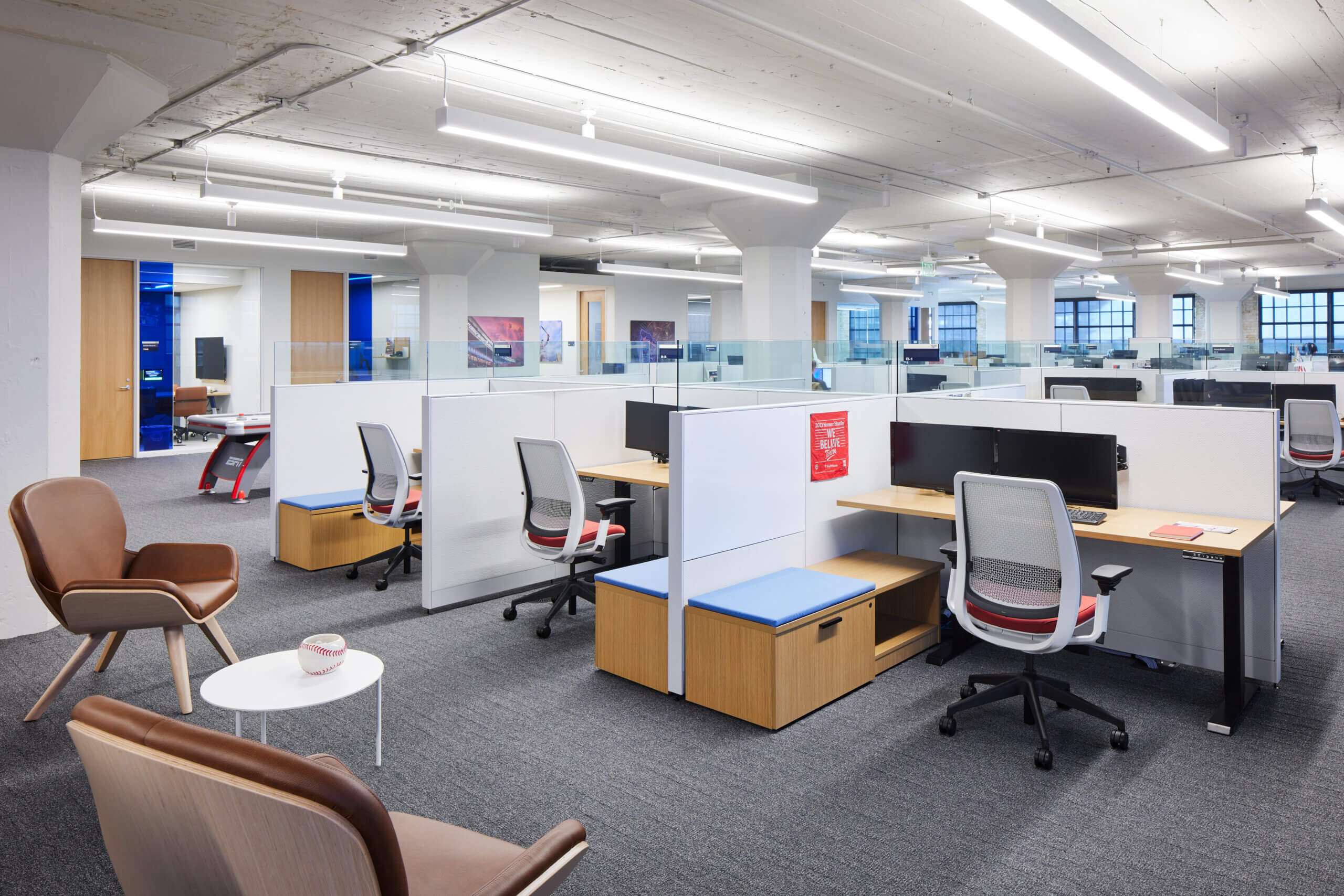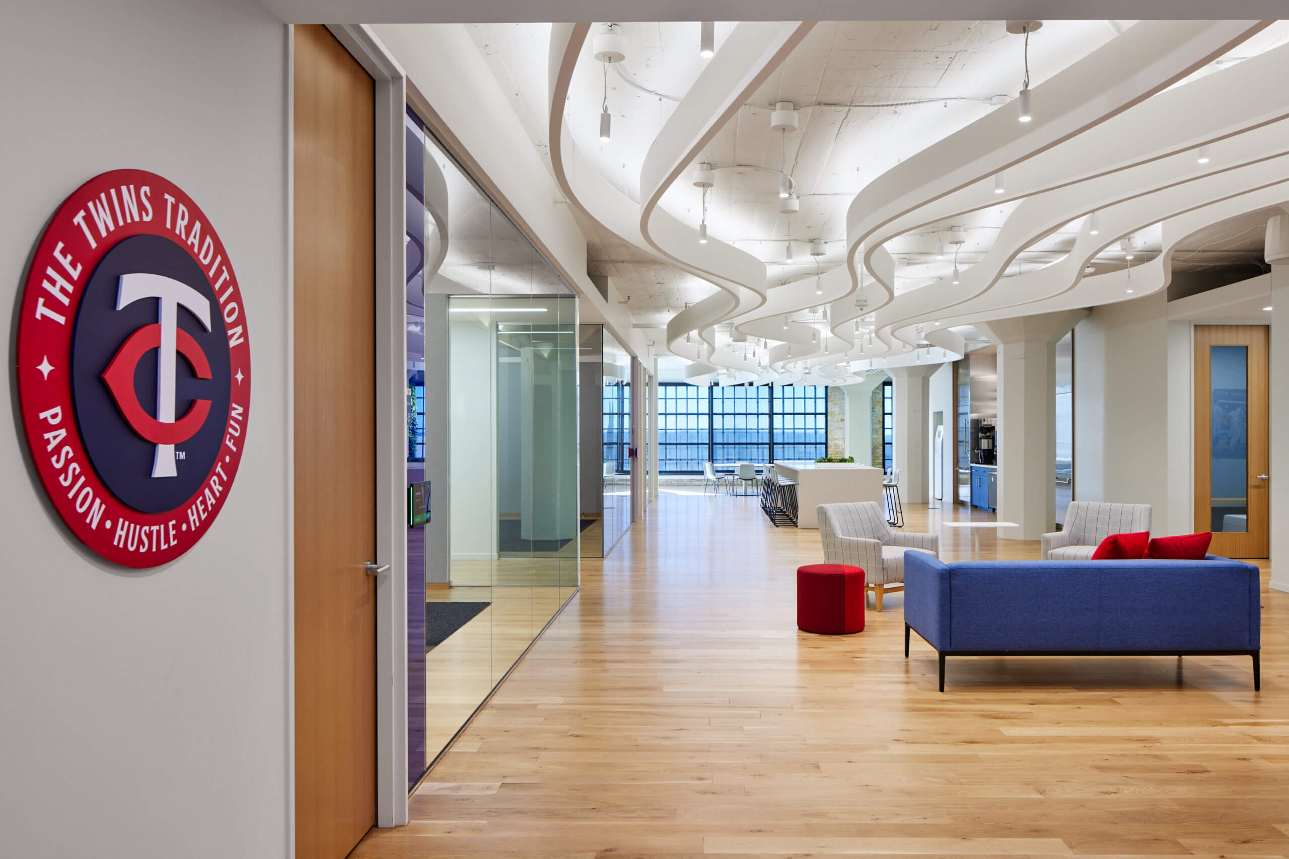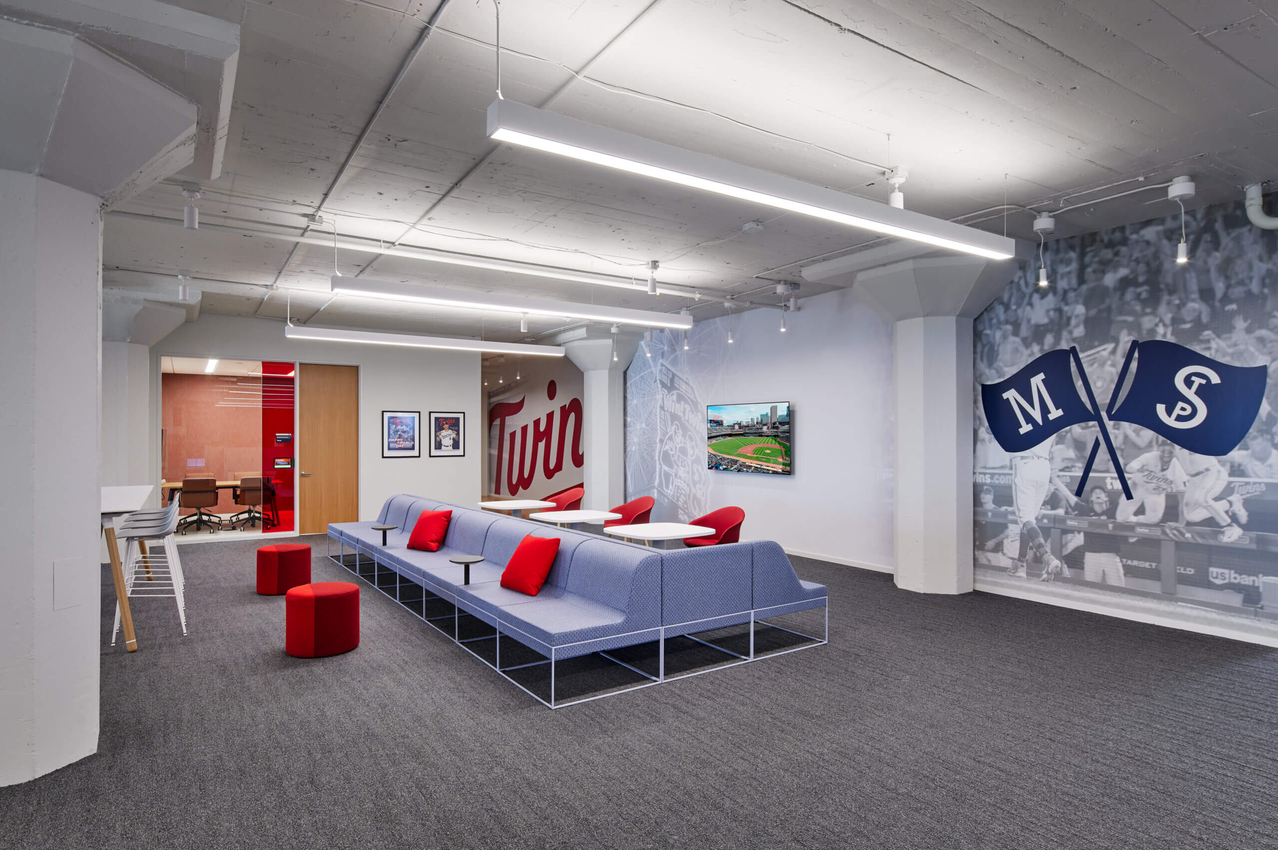 In 2023, Atmosphere executed HGA’s dynamic vision of creating a workplace tailored to the varied needs of the marketing and sales teams affiliated with the Minnesota Twins MLB franchise. Home to 121 employees, the new workspace features seven private offices, three large conference rooms, six smaller huddle rooms, eight individual focus rooms, more than 110 workstations, and two wellness rooms.