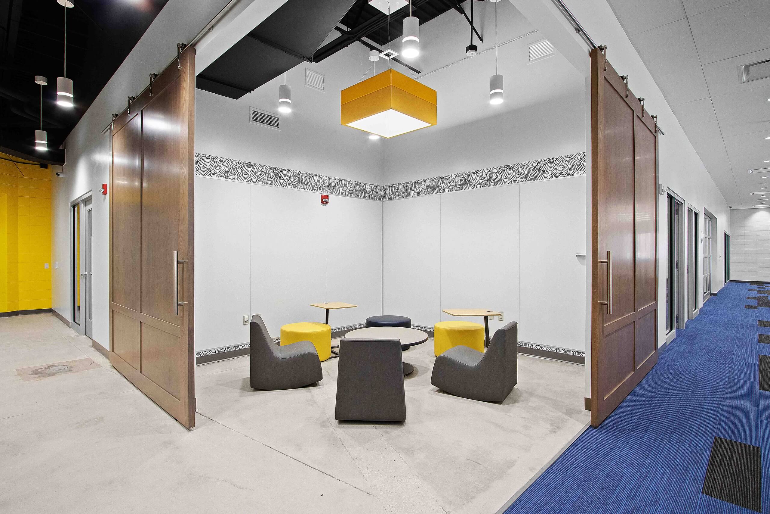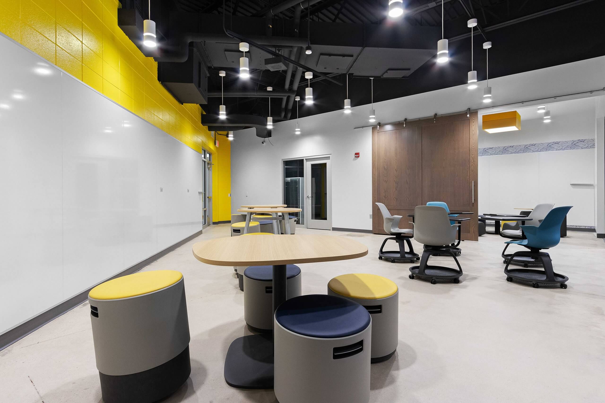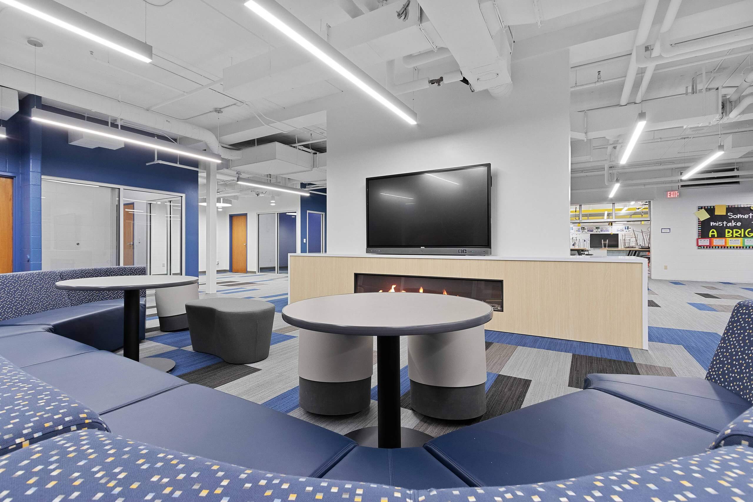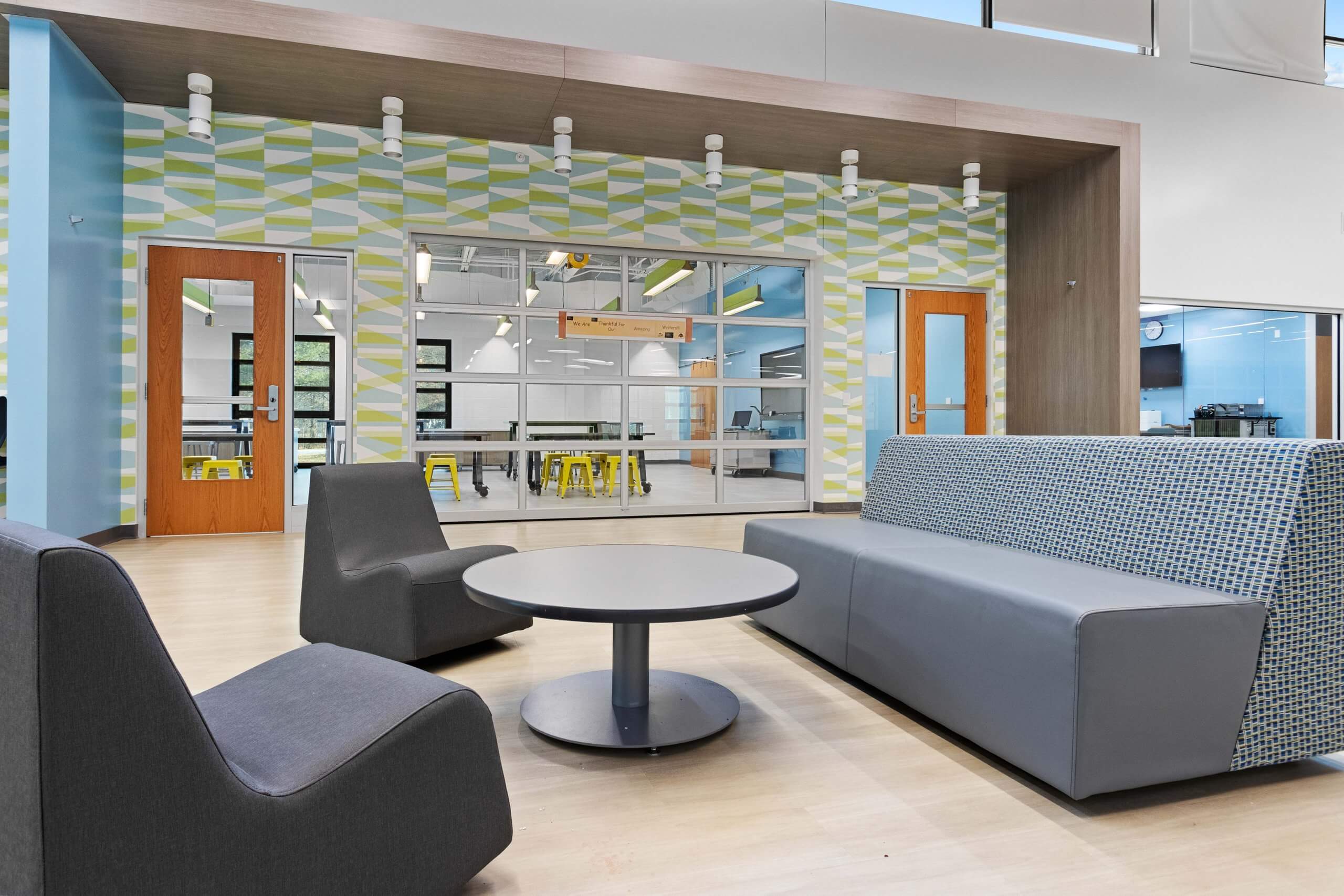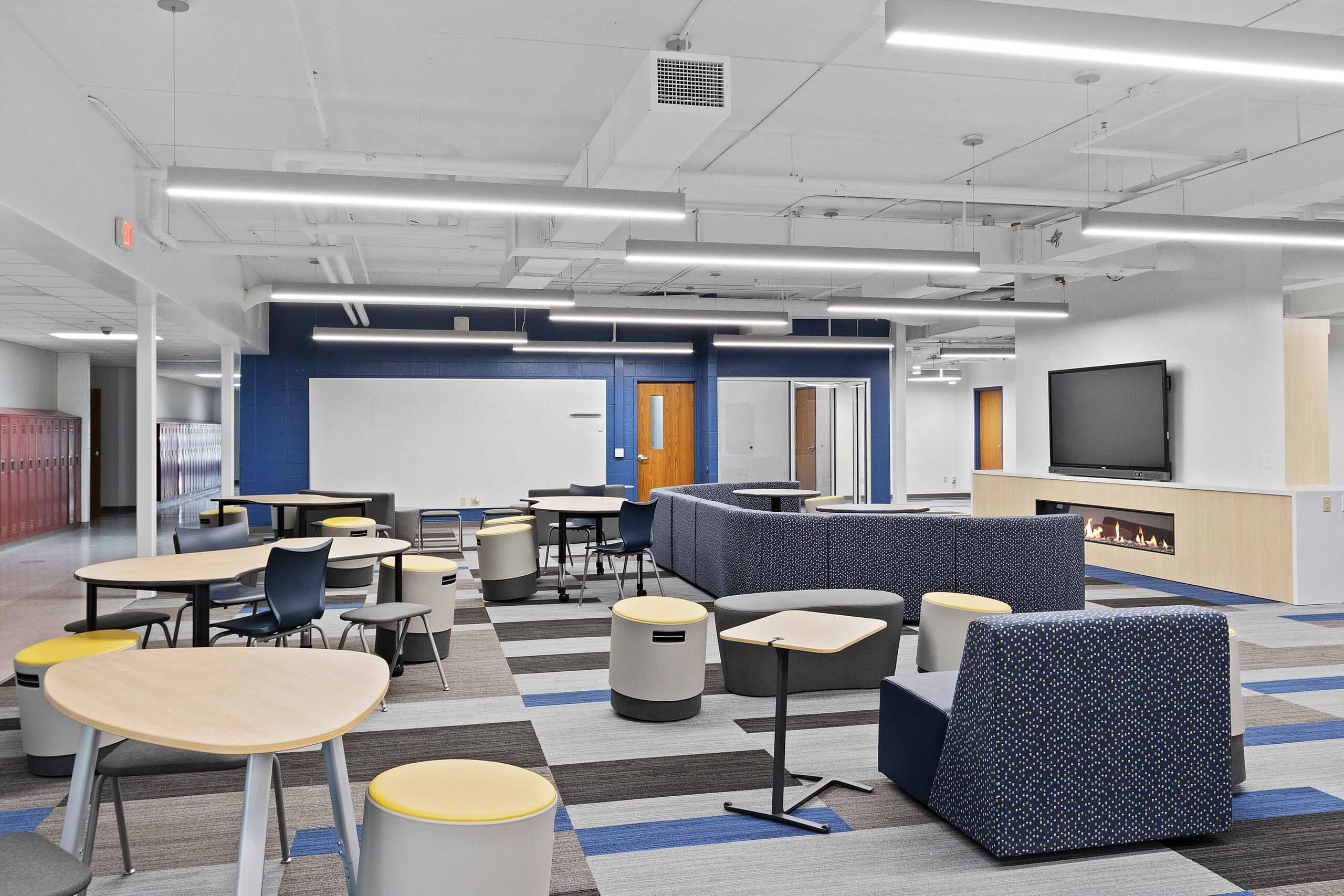 The overall project included a new high school cafeteria, renovation of the high school media center to incorporate a learning and tech lab, and renovation of the computer lab into a STEAM lab. The middle school updated special education classrooms to include sensory rooms, renovated the main office into a learning lab, transformed the computer lab into a STEAM lab, and created collaborative learning spaces. The elementary school added a new wing for classrooms, grades one through four got new furniture, and special education classrooms were updated.