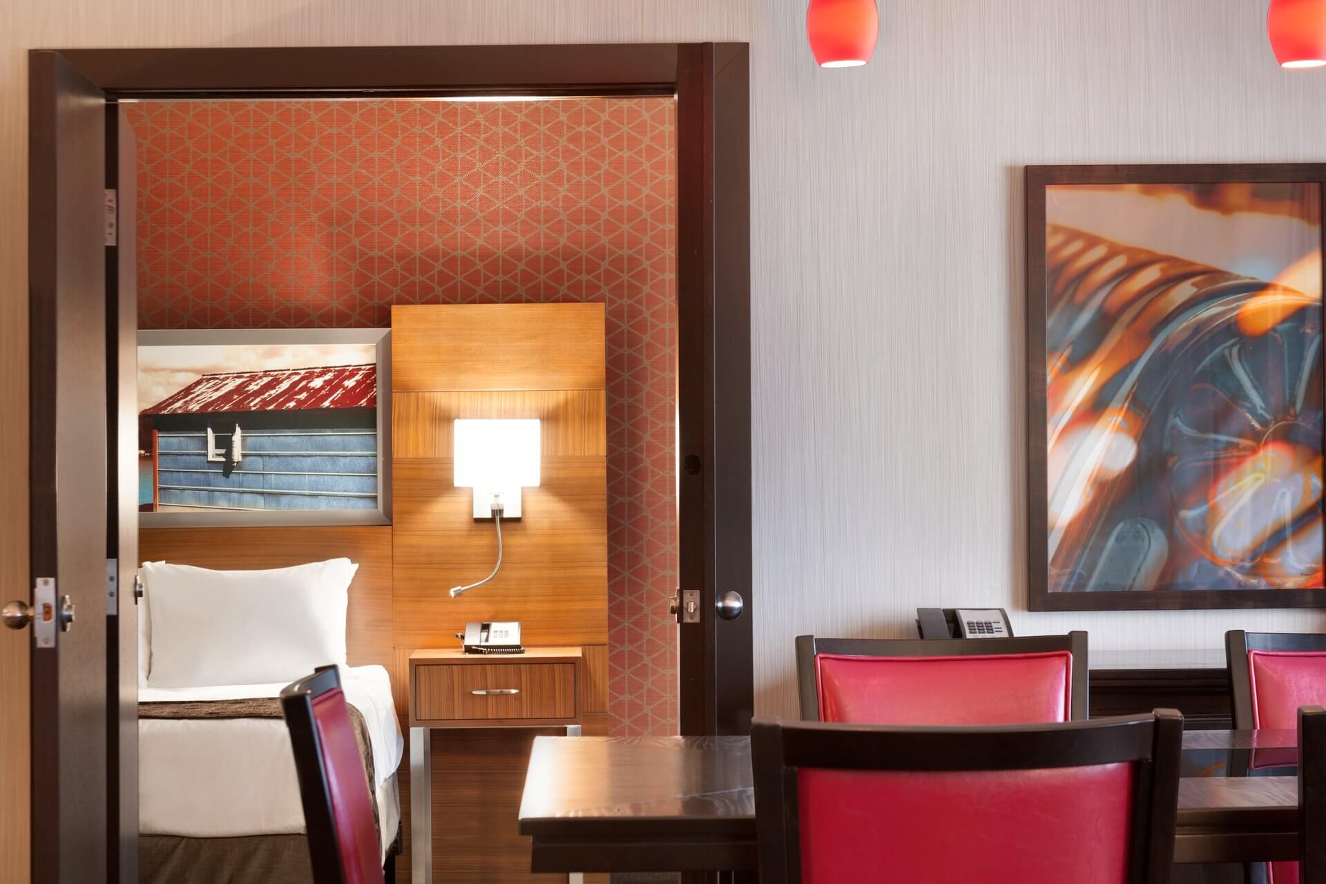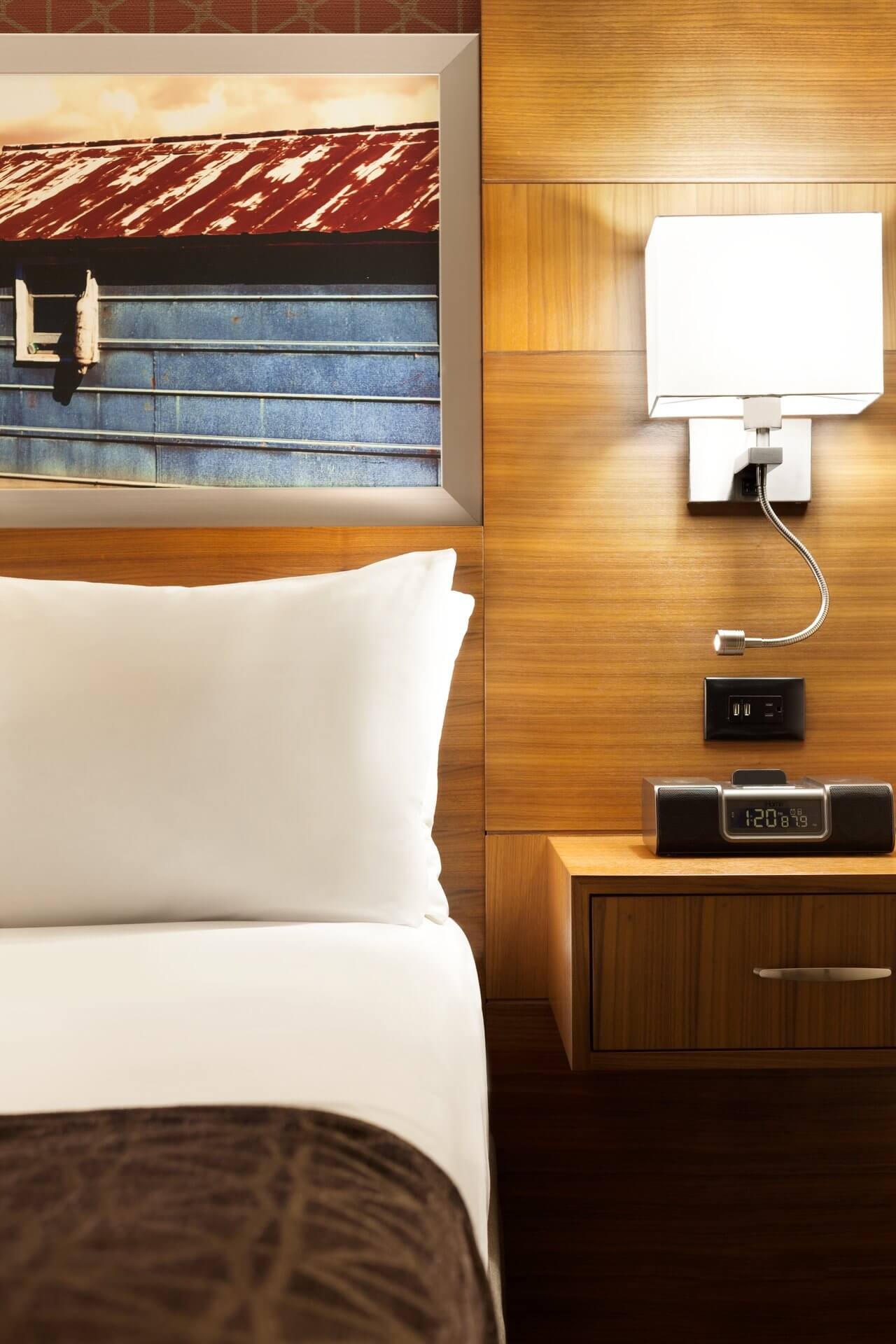 To begin, model rooms were quickly created to test, evaluate, and gain feedback on proposed product selections. From that, the team was able to provide alternate product and custom selections, such as locally sourced stone desktops, that kept the original design intent intact while saving a substantial amount of money. The team also commissioned artwork to be created with a local photographer to elevate the design of the hotel and to pay homage to nearby rich traditions.