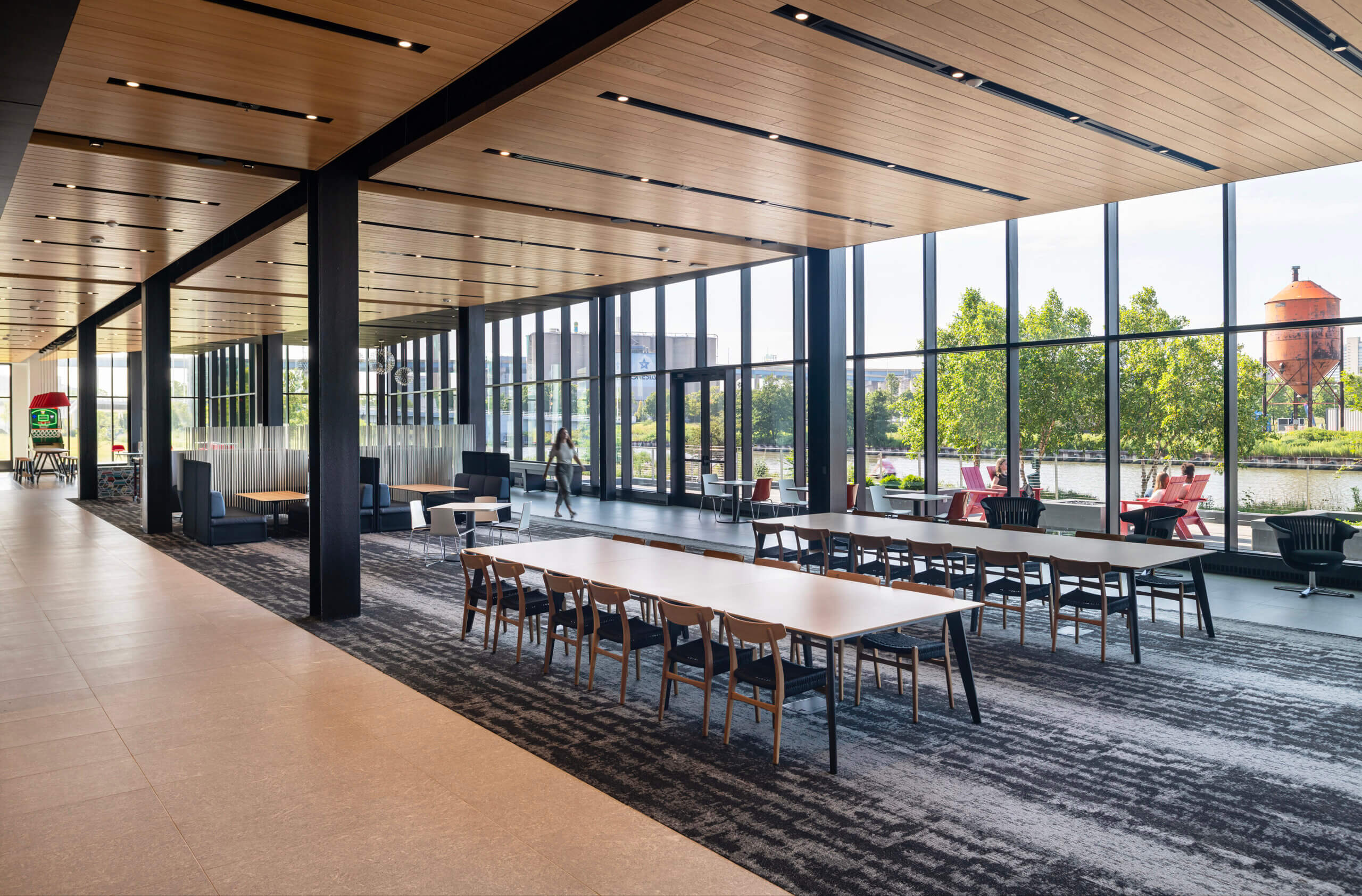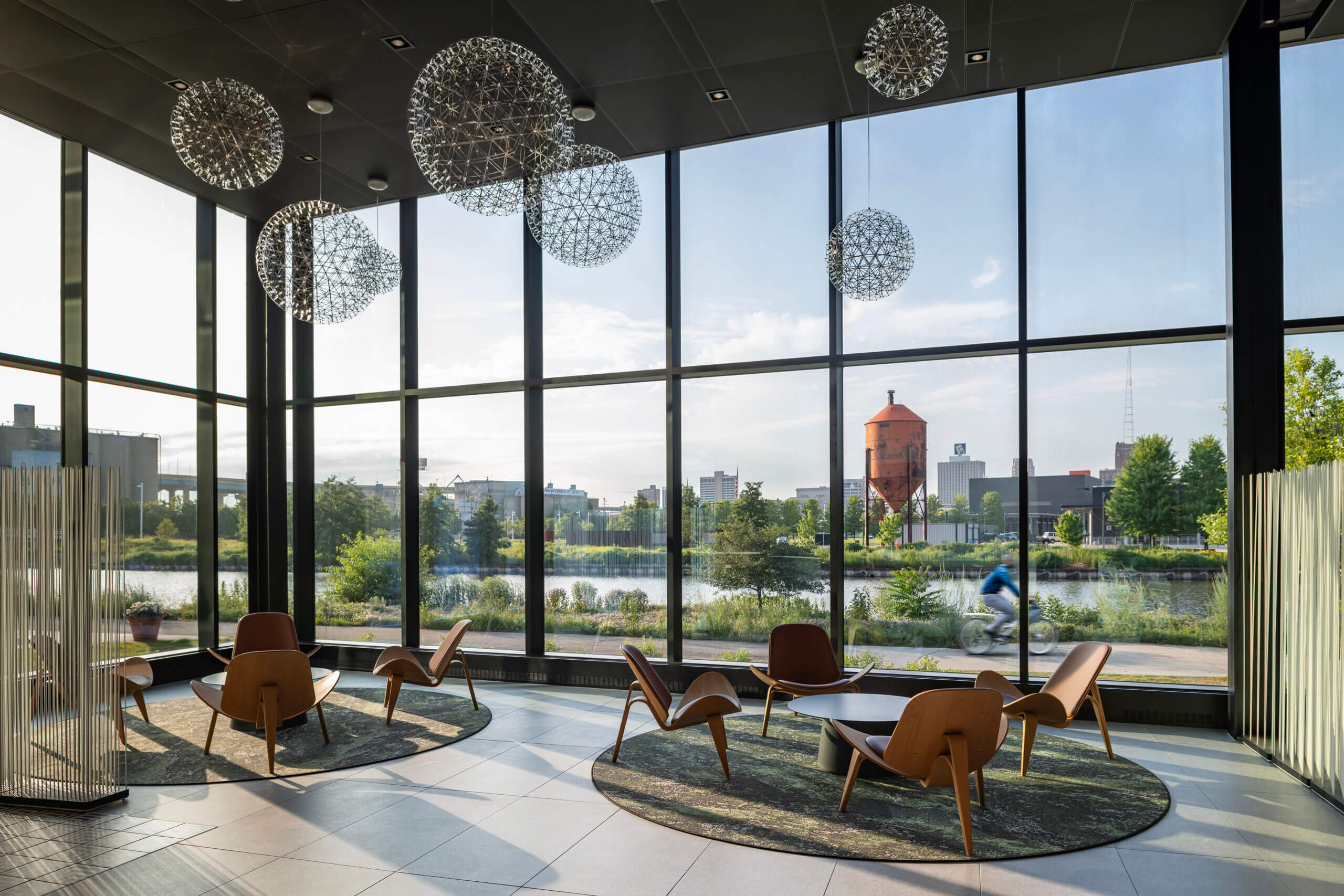 To ensure that expectations and goals were met, the teams held in-person bi-weekly meetings for six months to co-create and finalize design and product selections. The team took field trips to the Merchandise Mart in Chicago to view Steelcase furniture selections in person. The team also toured the Milwaukee Athletic Club and Sister Bay Furniture to view outdoor furnishings for the unique outdoor spaces that take advantage of Rite-Hite’s riverside location and their spectacular views of the downtown Milwaukee skyline.