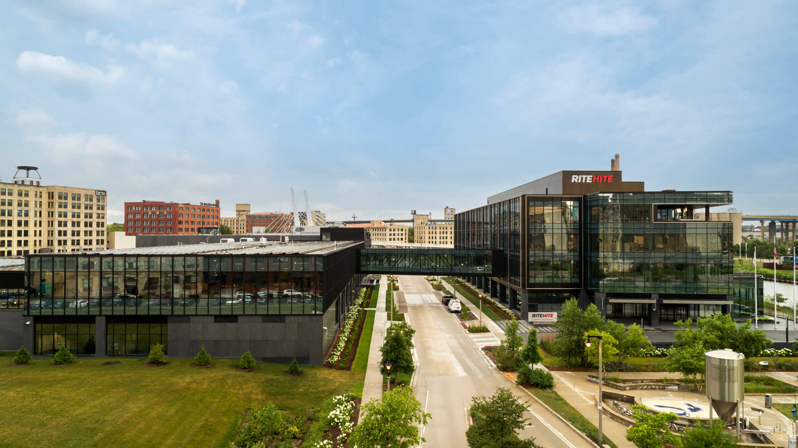 ​A world leader in loading dock equipment, industrial doors, safety barriers, HVLS fans, and more, Rite-Hite opened their brand-new world headquarters campus in Milwaukee, Wisconsin in March of 2023. The new site for this family-owned business encompasses two office buildings and a parking structure on 9.4 acres, allowing the company to bring together 300+ employees from four previous locations around the area and create room for future growth.